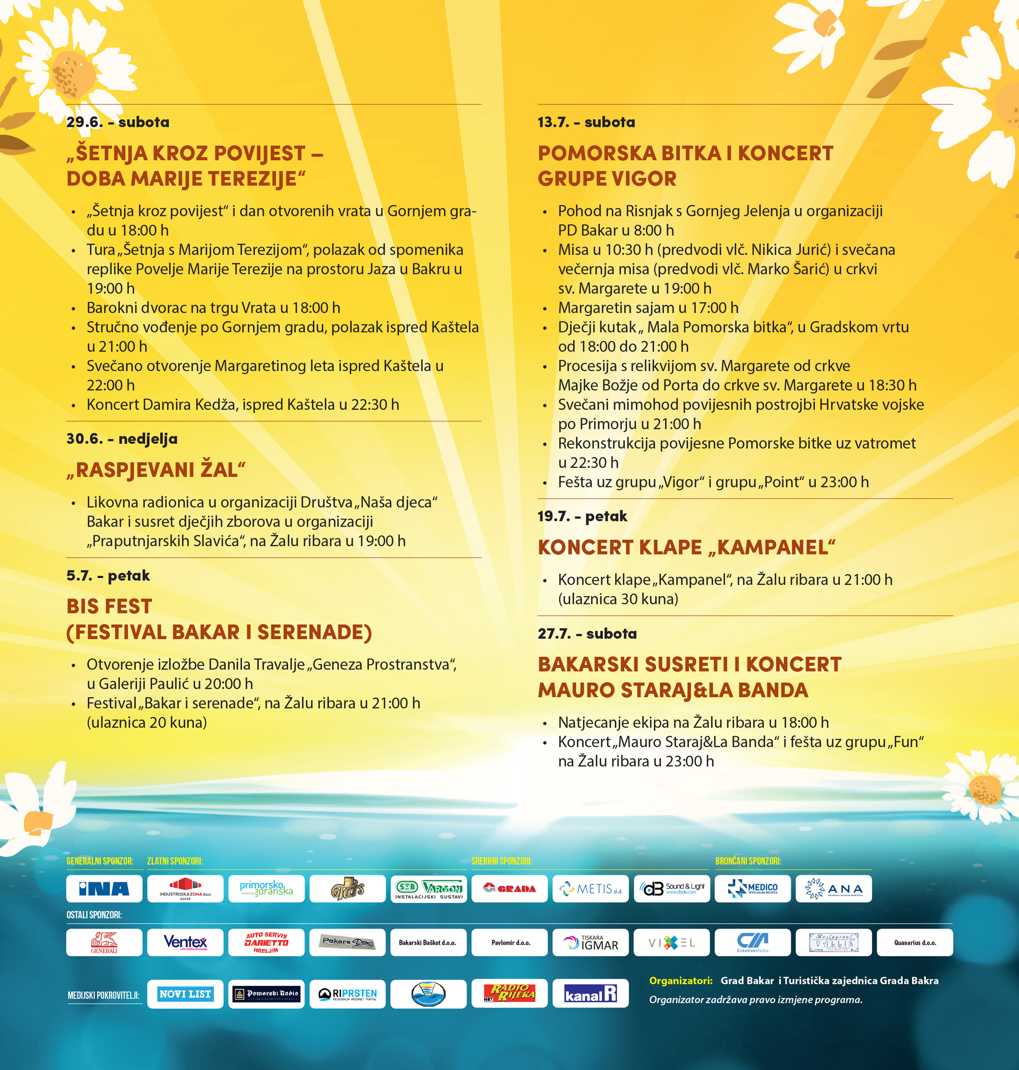 Pozivamo sve zainteresirane da taj dan dođu u Bakar, prošeću ulicama Gornjeg Grada, razgledaju izložbu u katakombama, posjete suvenirnicu, poslušaju nastupe na trgovima, a nakon svečanog otvorenja slijedi koncert Damira Kedža ispred Kaštela. Uz Šetnju kroz povijest zamjenica direktorice Tanja Tomas naglasila je središnje događanje Margaretinog leta (13.07) jubilarnu desetu Pomorsku bitku – dan kada u Bakarski zaljev uplovljavaju „mletački“ jedrenjaci, a brojne povijesne postrojbe sa kopna brane grad. Riječ je o uprizorenju povijesnog događaja kada su Mlečani posljednji put neuspjelo napali Bakar, nakon čega slijedi vatromet i fešta uz grupu Vigor i Point. U Gradskom vrtu održati će se i Mala pomorska bitka, namijenjena mlađim uzrastima gdje dječica kroz igru i zabavu na zanimljiv način saznaju nešto više o bogatoj prošlosti Bakra. Pod posebnim sponzorstvom INE u Gradskom vrtu mališane će dočekati gusarski brod na napuhavanje, potraga za blagom, razgled broda Hrvatske ratne mornarice, a sve to uz animatore i tete iz Dječjeg vrtića Bakar.