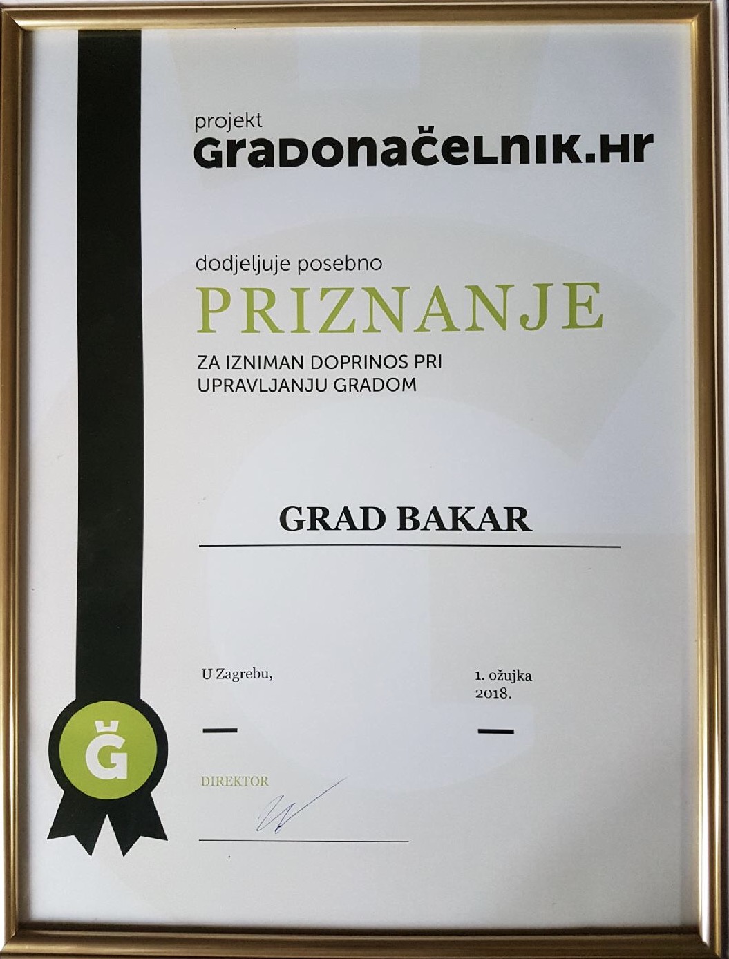 Grad Bakar dobitnik je službenog priznanja gradonačelnik.hr , za izniman doprinos pri upravljanju Gradom.